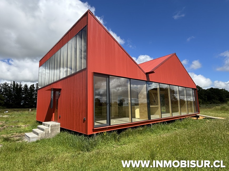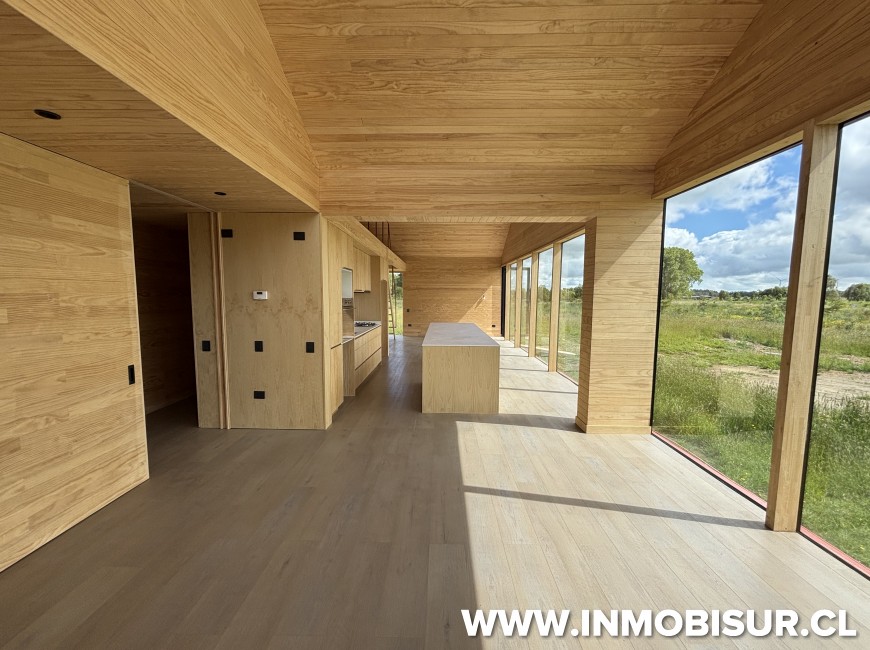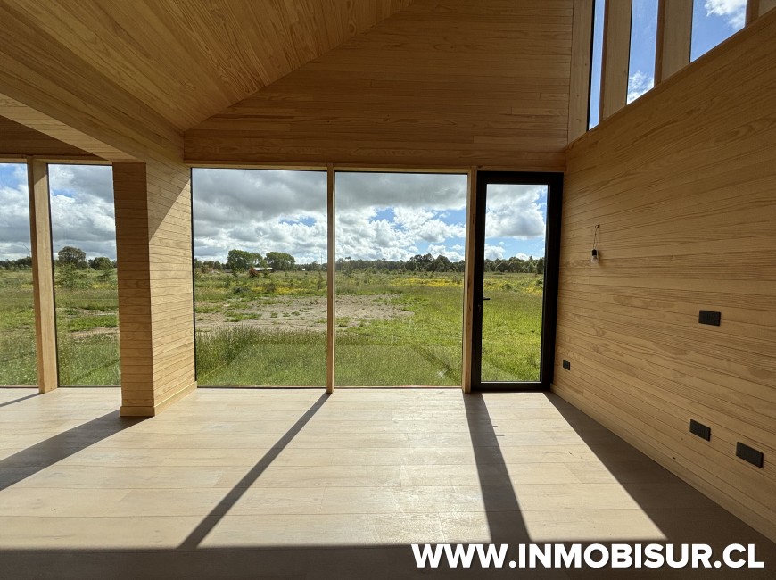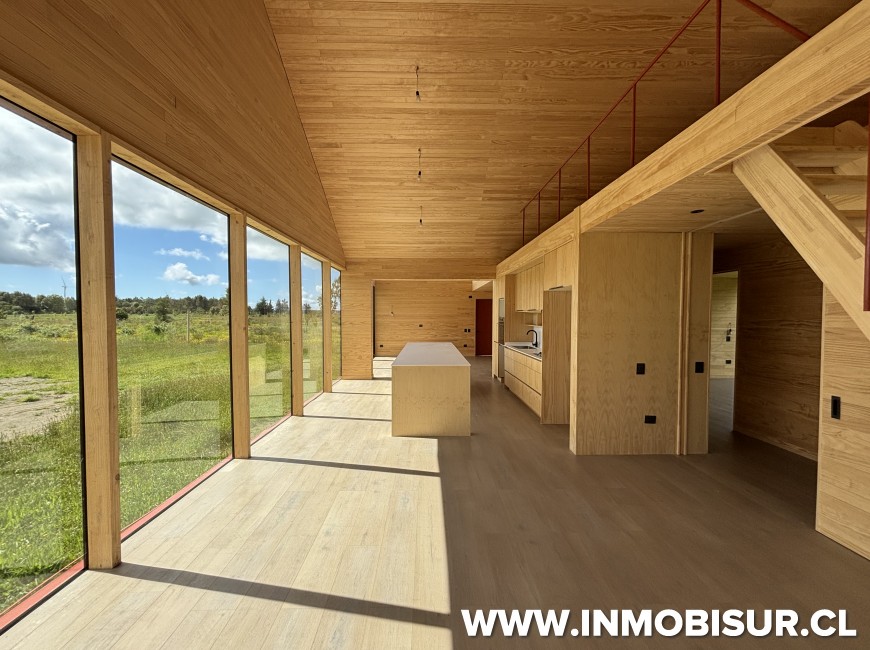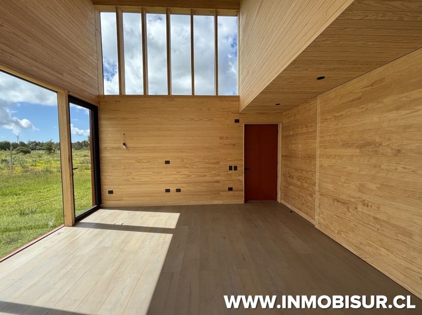 Con terminaciones de primer nivel, revestimiento en cielo y muros de pino clear, pisos SPC Osaka natural, ventanas de aluminio gris grafito con quiebre térmico, con excelente aislación, 16 cm de aislación de lanatherm y ventanas termopanel.