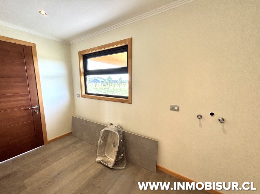 Interior de pino oregón impregnado, cadenetas a 40cm. Ventanas de PVC termopanel, pisos vinílicos de fabricación alemana, griferías Paini con garantías ATIKA, piso orgánico flotante.