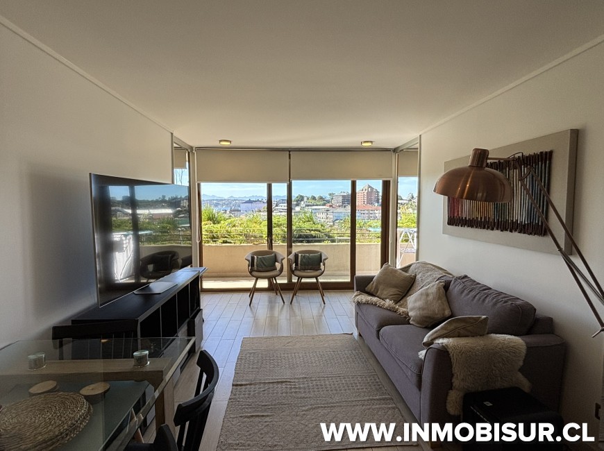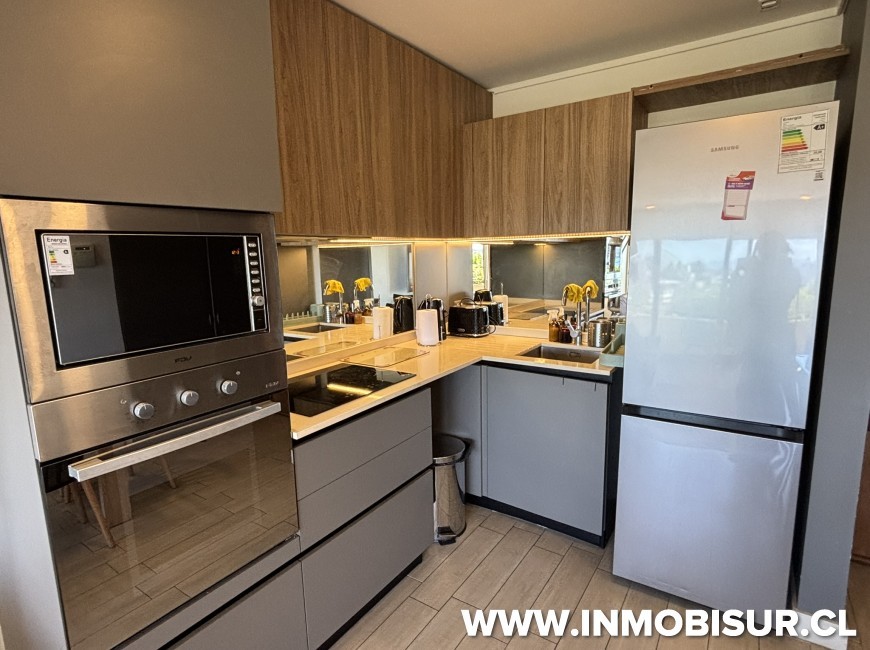 El departamento consta de 68 m2 + 11,95 m2 de terraza y cuenta con 2 dormitorios en suite con clóset, living comedor y cocina americana amoblada y equipada con encimera, horno, campana y microondas.