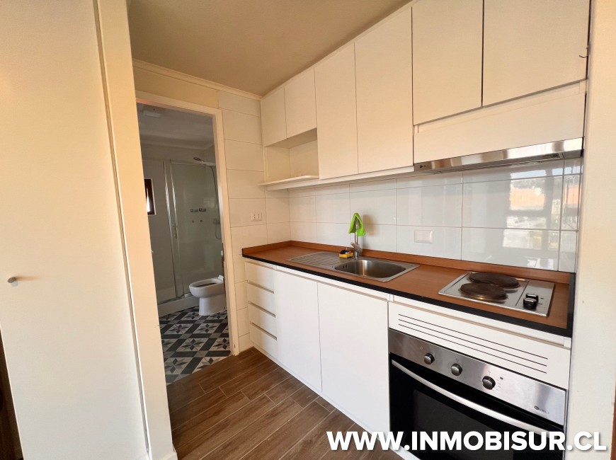 Living comedor , cocina americana, amoblada y equipada con encimera de 2 platos, horno eléctrico, campana, dormitorio en suite y baño con dos accesos.