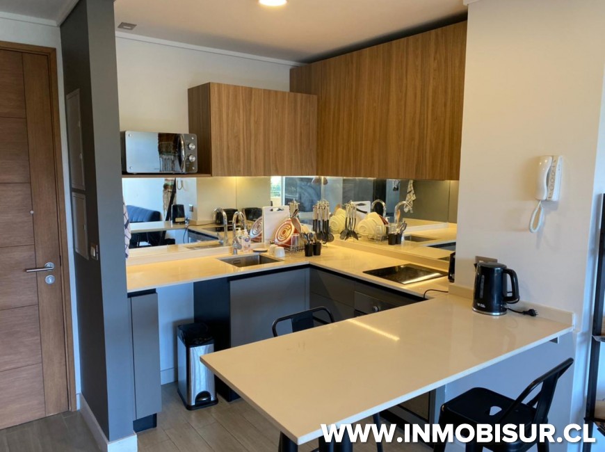 El departamento consta de 46,17 m2 + 7,34 m2 de terraza y cuenta con 1 dormitorio en suite con clóset, living comedor y cocina americana amoblada y equipada con encimera, horno y campana