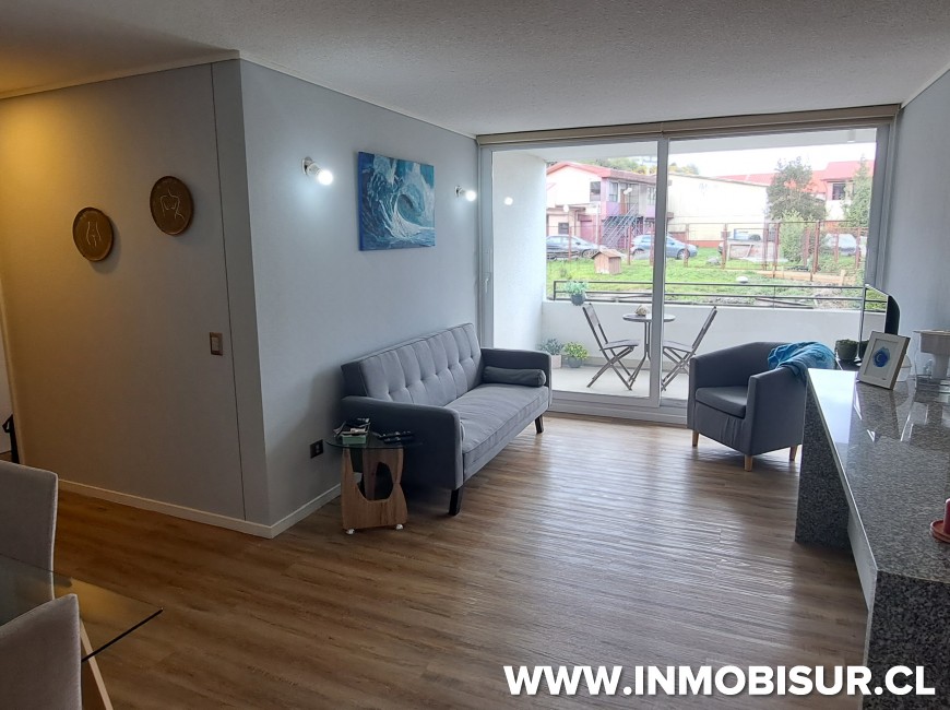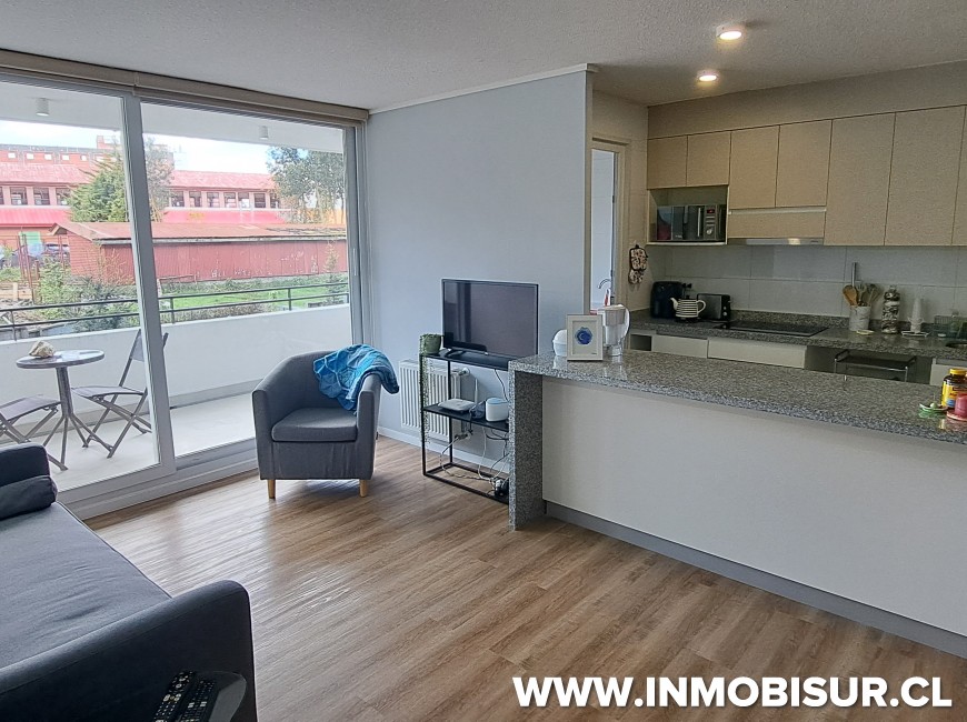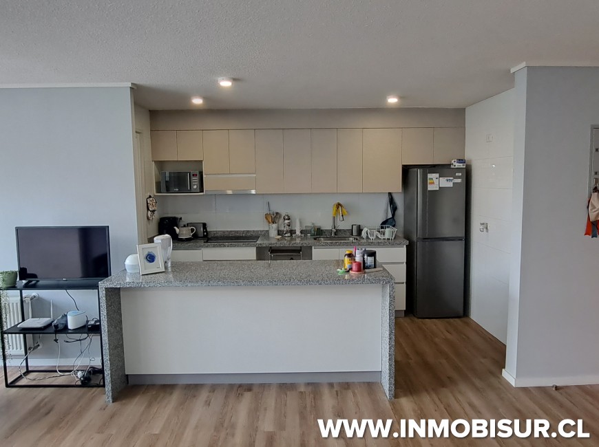 El departamento contempla living comedor equipado con comedor de 4 sillas, sofá, con cocina de concepto abierto, esta amoblada y equipada con horno, encimera, campana, refrigerador, loza para 4 personas, loggia con lavadora, baño familiar completo, dormitorio familiar con cama nido, dormitorio principal en suite con walking closet.