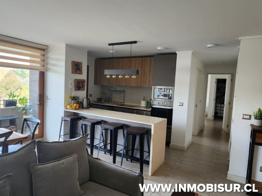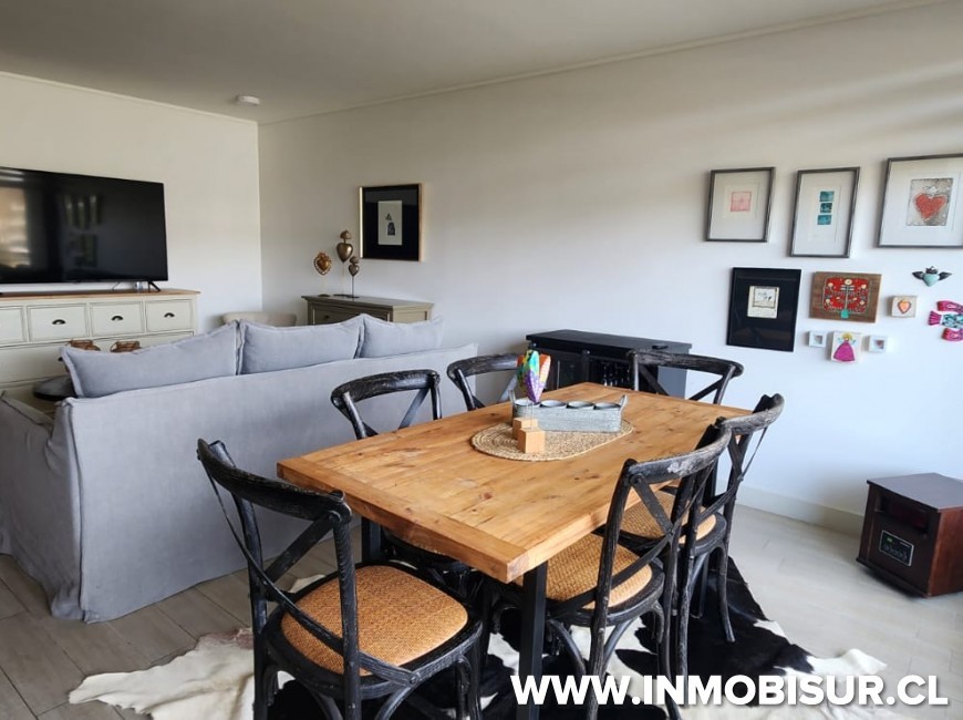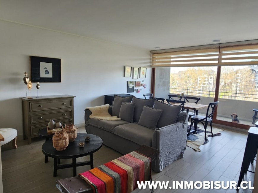 El departamento consta de 82,20 m2 + 6,46 m2 de terraza y cuenta con 2 dormitorios con camas, principal en suite con walking clóset, segundo dormitorio con closet, baño completo, living comedor con salida a terraza, cocina americana amoblada y equipada con refrigerador encimera, horno, campana, microondas, lavavajillas, logia con lavadora y bodega. Sin muebles en el living.