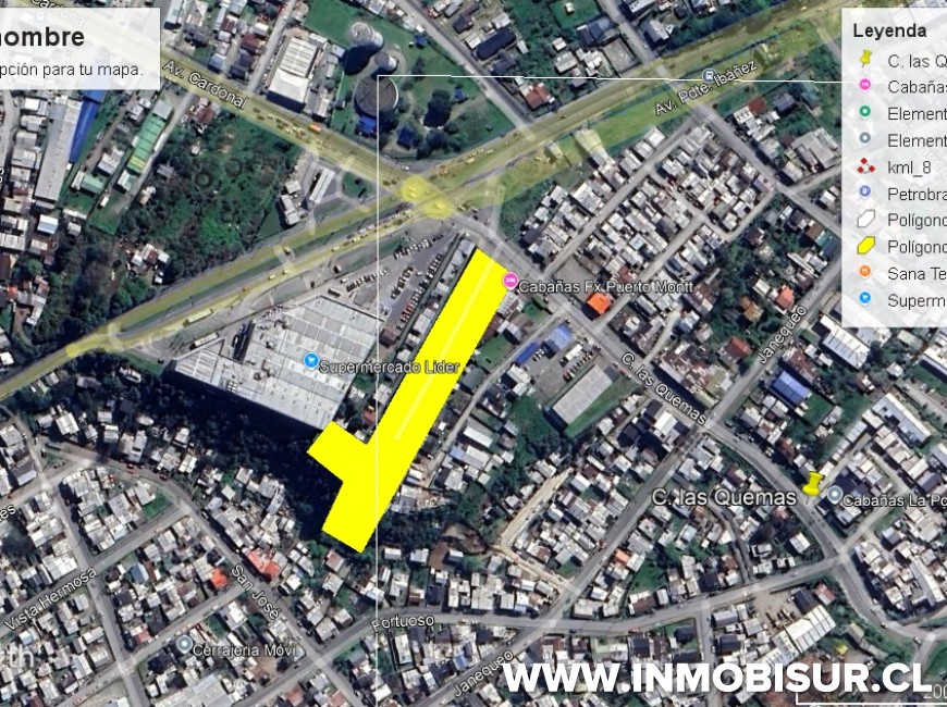 Espectacular terreno en pleno barrio comercial ideal para centro comercial, emplazado en calle Las Quemas que se convierte en Avenida Cardonal una de las principales de la ciudad y a metros de Presidente Ibáñez que es sin lugar a dudas la arteria comercial de Puerto Montt, rodeado de gran densidad de habitantes, comercio, industrias, a metros de la salida a Ruta 5 Sur y Ruta Tepual.